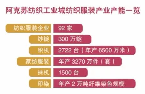 按照规划,到2020 年,阿克苏纺织工业城将形成棉纺600 万锭,机织布7.6 亿米,针织布7.2万吨,袜子20 亿双,服装1 亿件,家纺500 万件(套),印染10 万吨,工业总产值150 亿元,带动就业6 万人。未来,纺织工业城将努力建设成为承接南疆四地州劳动力转移就业和脱贫攻坚的产业基地、沿“一带一路”向西出口的重要纺织服装产品出口基地,争当推动经济高质量发展的排头兵,为实现社会稳定和长治久安总目标做出积极的贡献。